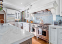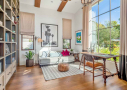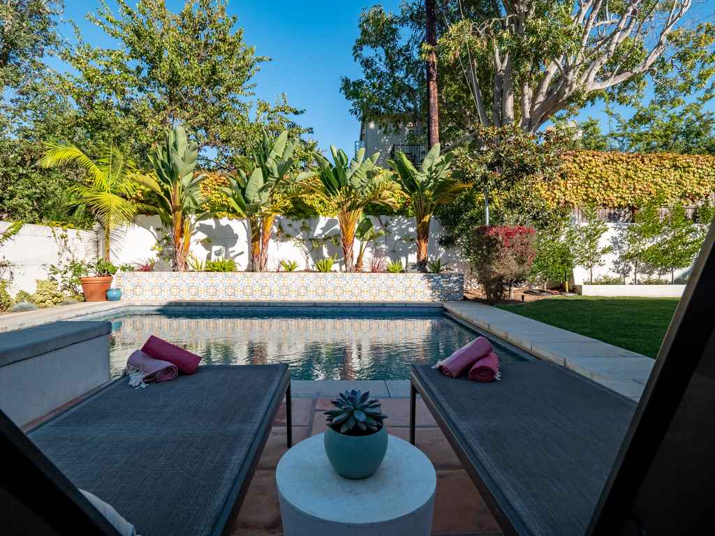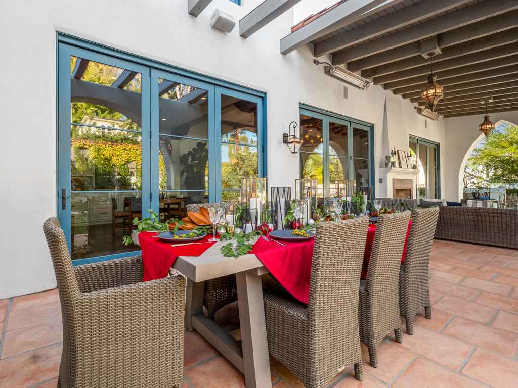 Staying true to the indoor/outdoor living vision, the loggia and backyard including a tile lined pool and jacuzzi, built in Big Green Egg grill and outdoor fireplace are directly outside accordion style doors.