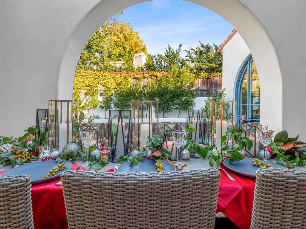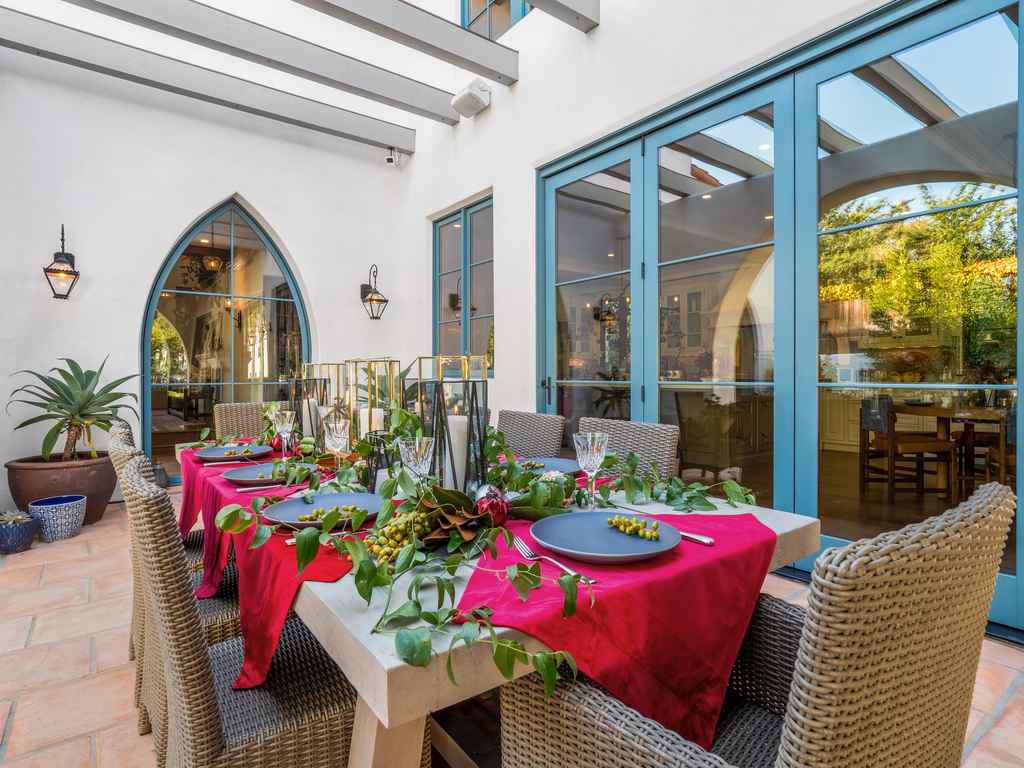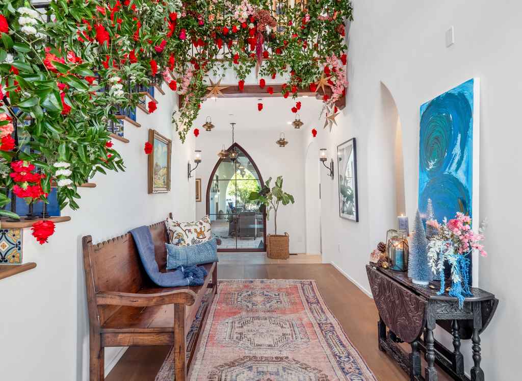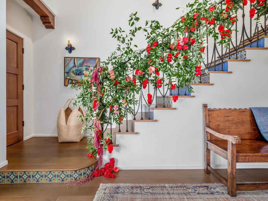 Inessa Nichols of Inessa Nichols Designs created the show stopping entry floral installment as well as the beautiful flowers throughout the home. Inessa Nichols Design wanted to showcase the style of this home by looking at the overgrown plant filled courtyards you will find all over Spain
