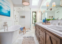 Nestled in the quiet, suburban neighborhood of Palos Verdes Estates, this romantic Spanish Colonial Revival home stands understated yet eye catching. This 3 Bedroom, 5 Bathroom residence boasts Mediterranean architecture and landscaping with an emphasis of indoor/outdoor living. Designed by architect Evan Braun, the homeowners had a vision of an authentic Spanish Colonial Revival style color palette with smooth white stucco, ironwork and windows trimmed in a Spanish blue hue. The tile roof is a functional design element that works to keep the house cool and is part of the design aesthetic. Evan designed a home that feels timeless. He helped the homeowners envision a home inspired by some of the original architects like Wallace Neff. While it is newly built, it has details that make it feel as though it has been here for years. It is hard not to appreciate the enduring details juxtaposed with a modern floor plan.