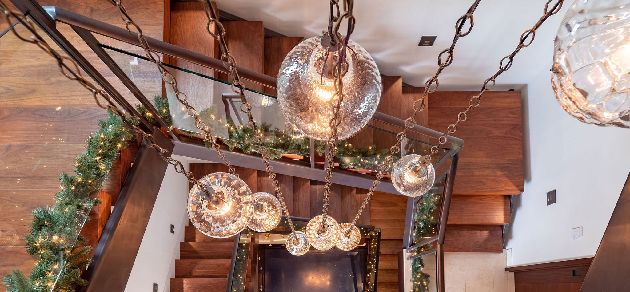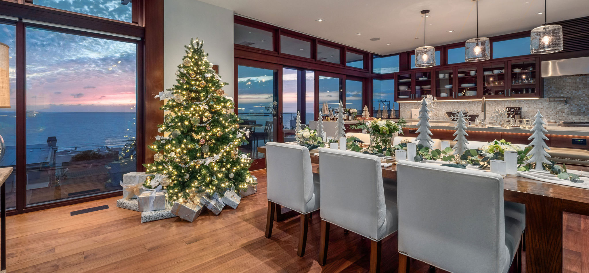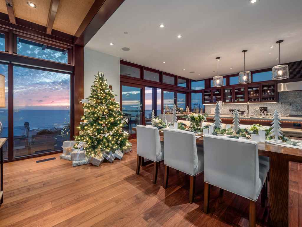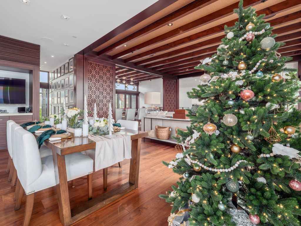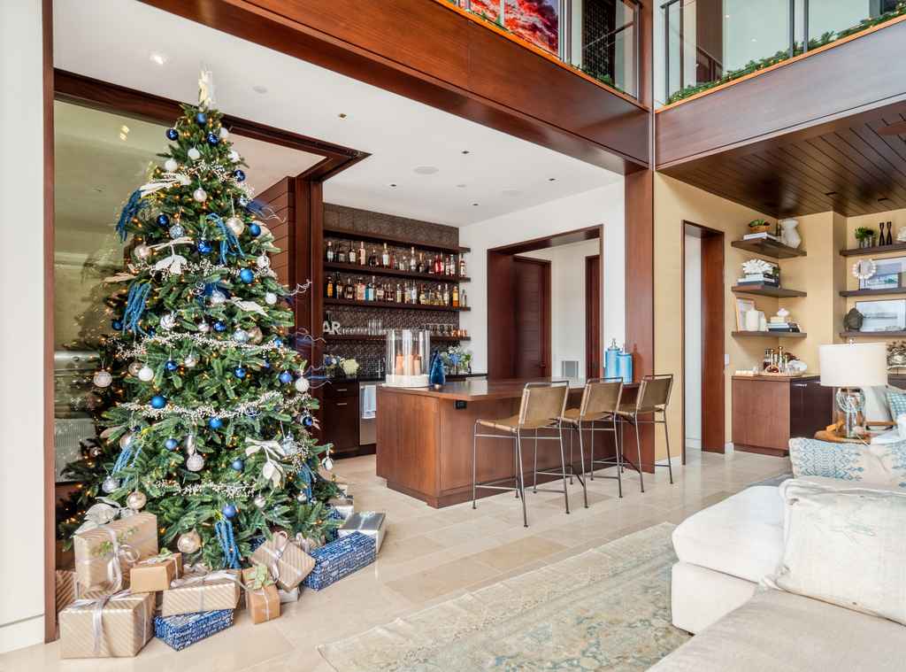 A Chrismukkah theme carries throughout the house, incorporating the traditions of both Christmas and Hanukkah, and the home is brought to life by Caroline Burke’s interior design, Maison Luxe’s styling and Feathered Arrow Events’ festive creativity. Deep Roots Garden Center supplements this decorative vision with custom floral arrangements throughout the property and organizational dreams come true with the work of Life in Jeneral. This corner lot beauty exudes one of the best curbside appeals on the block. Prepare to be transported to a tranquil resort as you enter the contemporary pivot door of this magnificent home.